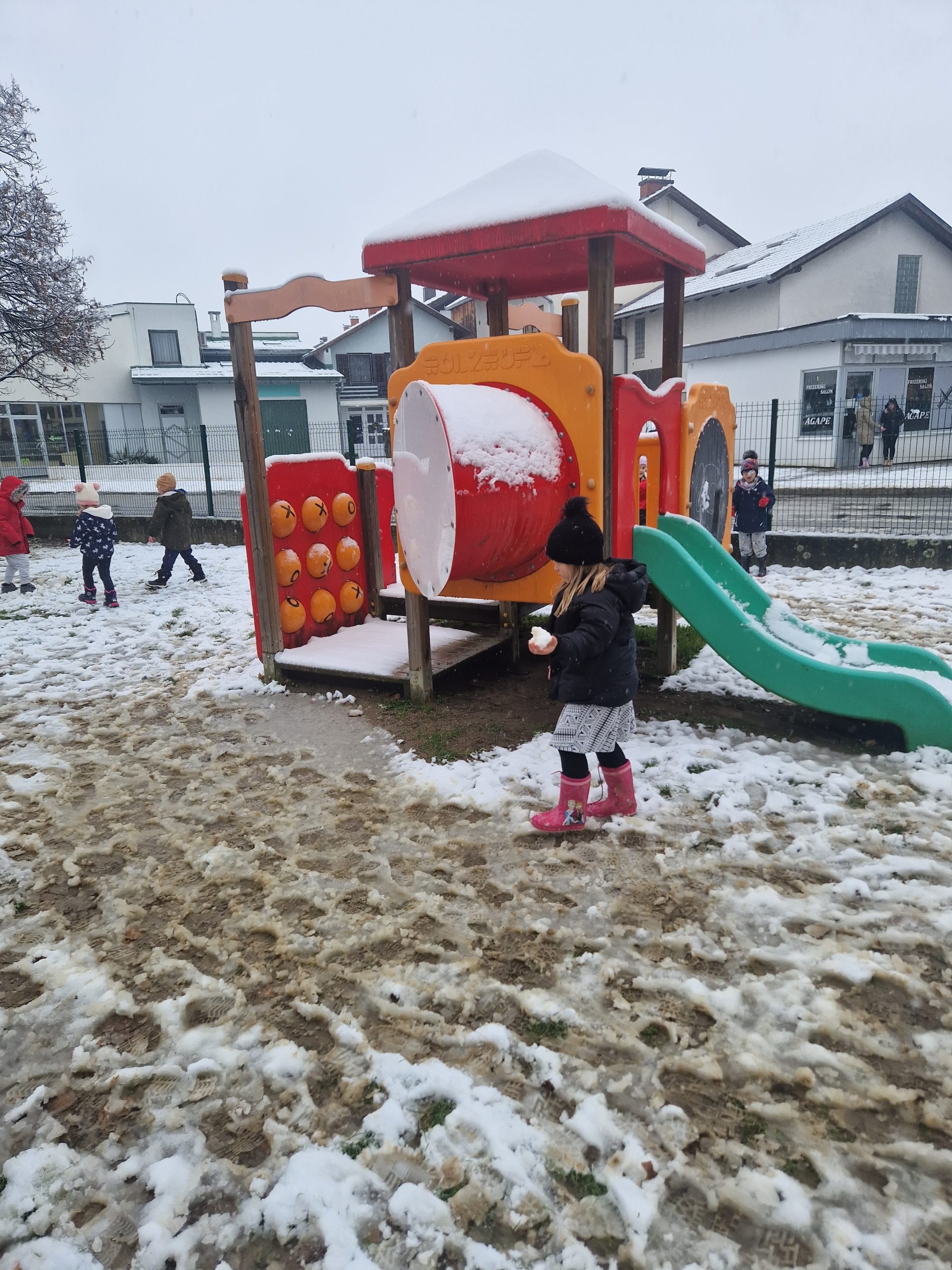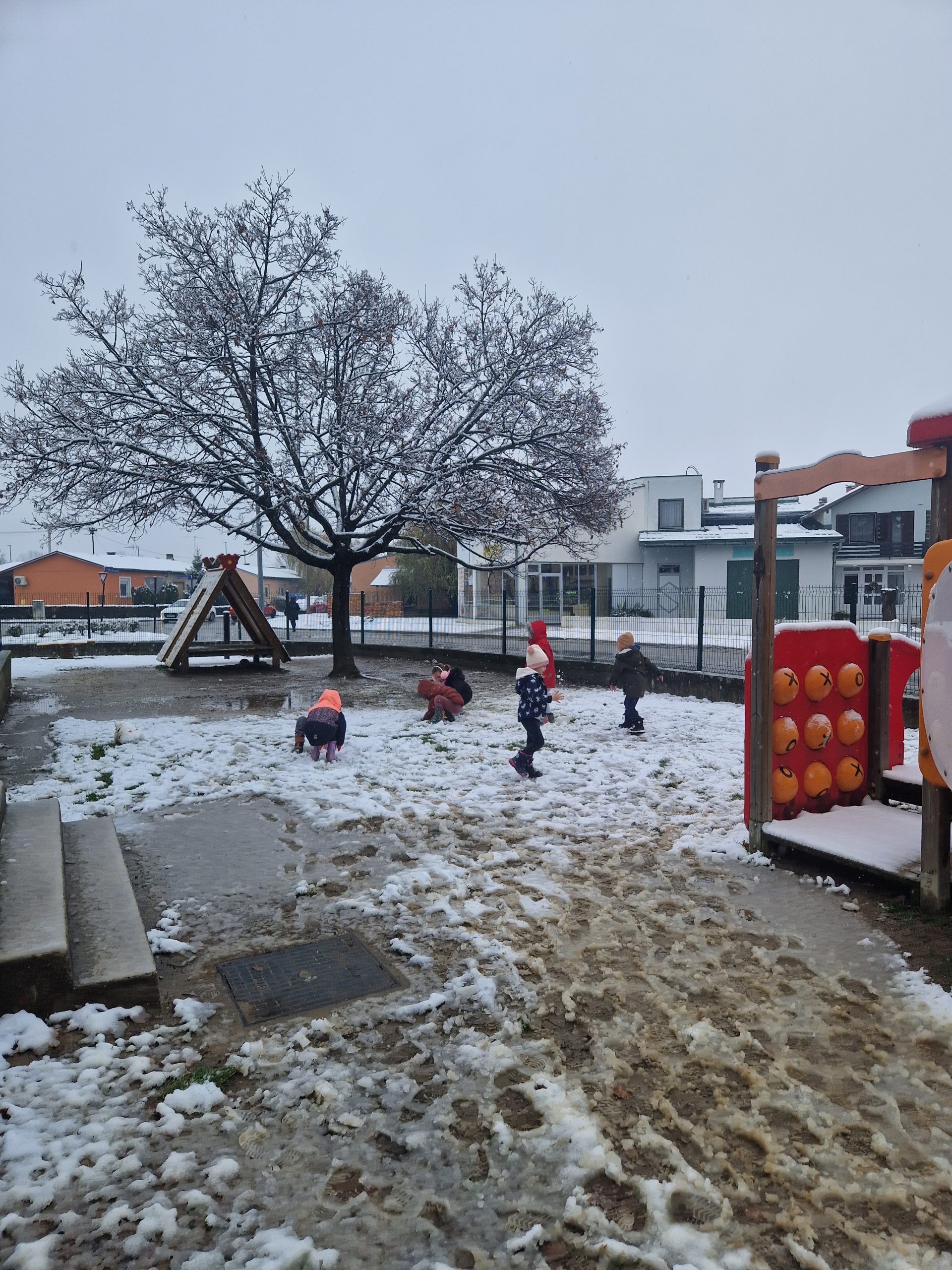 Prvi snijeg djeca su nestrpljivo čekala i upravo im je on bio izvrstan poticaj za igru i boravak na svježem zraku. Susret sa snijegom djeci je uvijek nezaboravno iskustvo te su ga iskoristili za istraživanje, izradu kuglica i igru. Također, niska zimska temperatura potaknula je djecu na razgovor o zimskoj odjeći i o tome gdje su se sakrile ptičice iz dvorišta dječjeg vrtića.